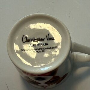 Cute collectible Christopher Vine dog-print ceramic coffee mug featuring a brown and white dog illustration with red accents. Bright red bow detail adds playful charm. Durable glazed finish for everyday use. Stylish and pet-loving design that makes a great gift.