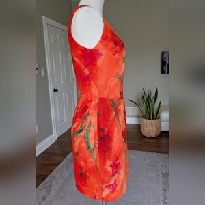 Vintage Joseph Ribkoff Floral Sheath Dress Orange Red Watercolor Print Size 8