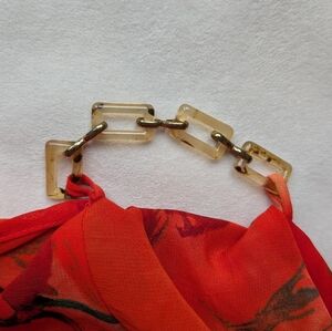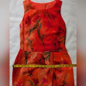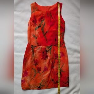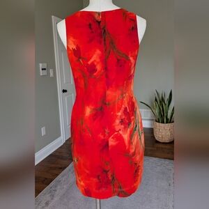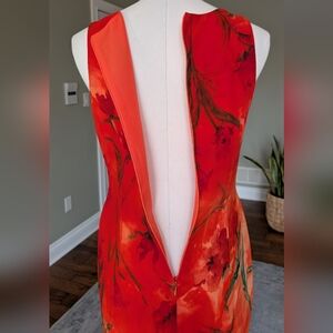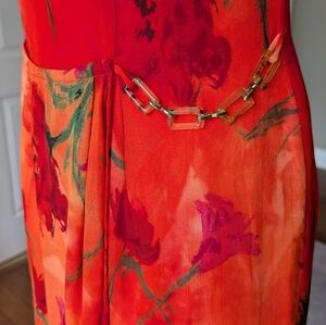 Beautiful Vintage Joseph Ribkoff dress made in Canada featuring a vibrant orange and red watercolor floral print. This sleeveless dress has a flattering fitted sheath silhouette with a back zipper closure. The design includes a decorative chain detail at the waist that adds a unique accent to the look. Lightweight fabric with lining for comfort. Elegant and eye-catching piece perfect for events, summer occasions, or evening wear.