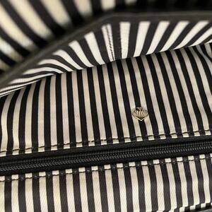 Interior is fully lined with Kate Spade’s signature black-and-white stripe fabric and includes multiple compartments for easy organization. Exterior zip pocket on the back for quick-access items.