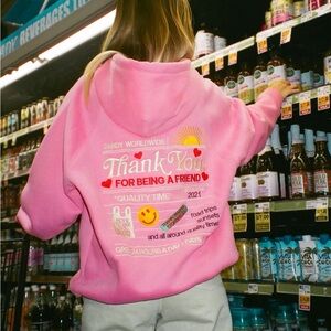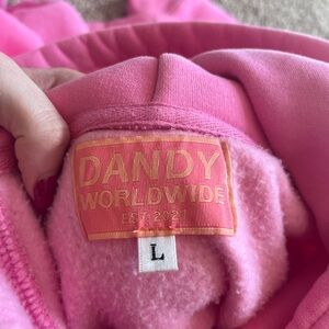 This bright pink hoodie features the “Thank You – Dandy Worldwide” embroidery on the front along with small embroidered heart details on the hood and pocket for a playful touch. Perfect for casual wear, lounging, or layering.