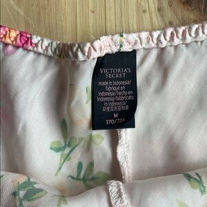 Soft pink floral camisole and matching shorts with delicate lace trim. Lightweight, breathable fabric for comfortable sleep and lounging. Feminine pink floral print with subtle green leaf accents. Adjustable straps and elastic waist provide a customizable fit. Amazing pre loved condition size medium by Victoria's secret