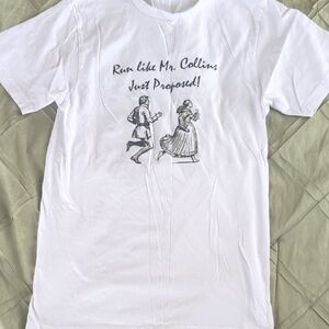 White t-shirt featuring a graphic design with Mr. Darcy and a quote. Perfect for literature and Jane Austen fans.