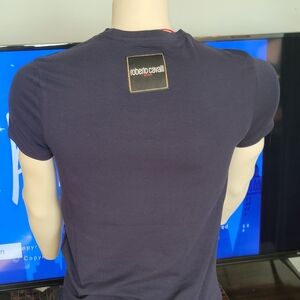 ROBERTO CAVALLI NAVY DARK BLUE short-sleeve tee with bold multicolor graphic on front. Soft, lightweight cotton for everyday comfort. Eye-catching red, yellow and cream accents add sporty style. ๐ก ๐ด ๐ต