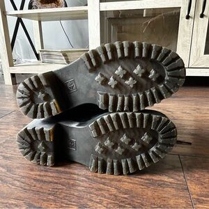 These black combat and moto boots are crafted from durable leather, featuring a lace-up design with metallic eyelets. The thick, chunky rubber sole and distinct platform provide excellent grip and added height.