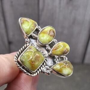 This Palomino Turquoise Cluster Ring in size 7 is a beautiful piece of Southwestern style jewelry crafted from sterling silver. It weighs 9.91 and has a 4.5mm band. The ring features 5 palomino turquoise stones in mixed shapes. Handmade in the United States, this ring with a split shank and closed back design is perfect for occasions like Christmas, anniversaries, and birthdays. The unique blend of Western, Bohemian, Native American, Southwestern, and Ethnic themes make this ring a standout accessory for women who appreciate ethnic and regional jewelry.
