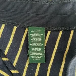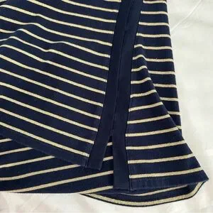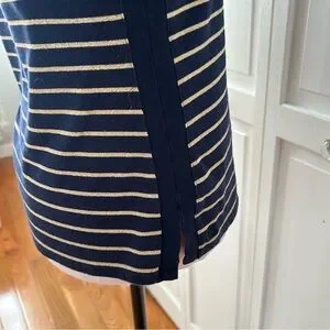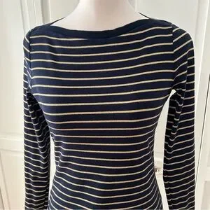 Lauren Ralph Lauren top is a classic, nautical-inspired piece characterized by its navy blue and metallic gold horizontal stripe pattern.