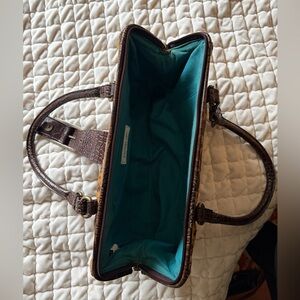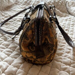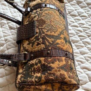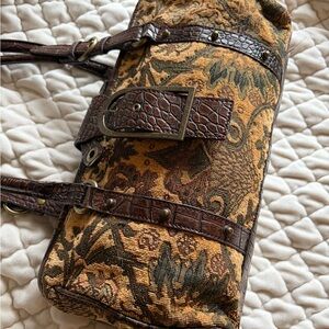 Vintage Bohemian style š¤©Gorgeous High Quality tapestry / carpet handbag by the brand āEmilie Māš~These bags typically feature a bohemian floral pattern paired with faux-crocodile leather accents and a prominent buckle detail. RIGHT ON TREND for 2026!! š¤©Looks and feels better in person!!