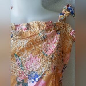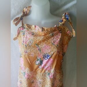 Lightweight sundress with adjustable tie shoulder straps. All-over floral print with lace-like patterning. Soft mustard background with pink and blue floral accents. Feminine and breezy style. Perfect for warm weather.
