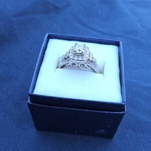 This stunning vintage ring features a dazzling center diamond encircled by a halo of smaller diamonds, all set in a luxurious gold and white gold design. The band is intricately crafted, splitting into multiple strands that add elegance and sophistication to the piece. Perfect for marking special moments, this ring is a true testament to timeless beauty.