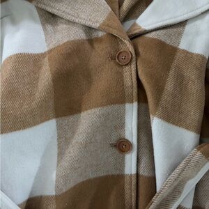 This stylish coat is perfect for layering during transitional weather and adds a polished look to both casual and dressy outfits. The timeless plaid pattern and structured design make it a versatile wardrobe staple.