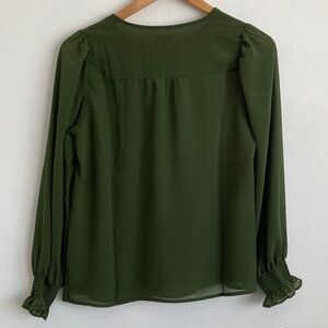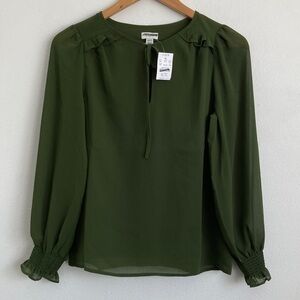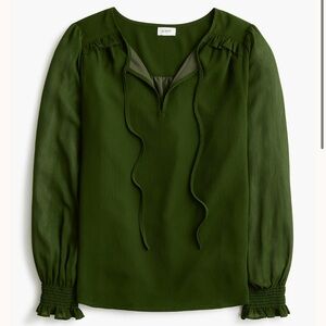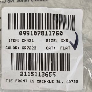 Light crinkle fabric with a tie-front detail. Long sleeves and a relaxed fit. Versatile for day or evening wear.