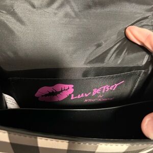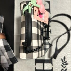 Betsey Johnson plaid box bag in black and white. Features a bright pink lip logo and script inside. Top handle and removable chain strap. Playful, fashion-forward look. Black Hardware, cute charm