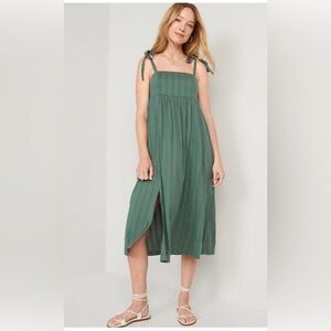 Effortless and versatile Old Navy maxi dress in a soft sage green color. This dress features adjustable tie shoulders, a flattering maxi length with a side slit, and a lightweight textured fabric that’s comfortable and breathable. The relaxed silhouette makes it perfect for warm weather, and it also has side pockets for extra convenience.