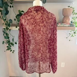 Express Burgundy Paisley Long Sleeve Sheer Button Front Blouse Large Office Fall