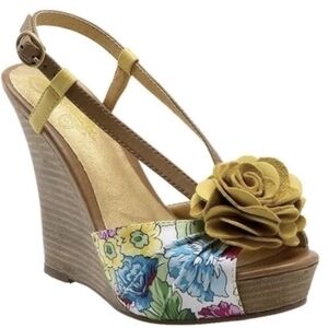 These retro-inspired "Joan" wedges from Seychelles were originally sold at Anthropologie. They feature a vibrant yellow and pink floral fabric upper, accented by a 3D yellow leather rosette and tan leather-look ankle straps. The stacked-style wedge and playful colors make them a quintessential summer staple.