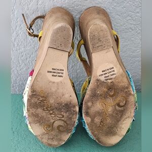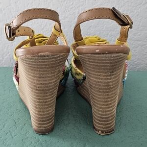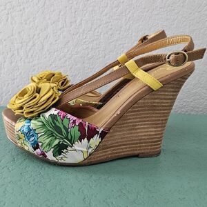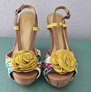 Anthropologie Seychelles Joan Yellow Floral Stacked Wedge Strappy Sandal Size 7