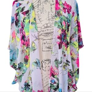 OP white multicolor floral open front cardigan kimono. Semi-sheer, fringed hemline, stitched sleeves. Lightweight oversized fit. Excellent used condition.