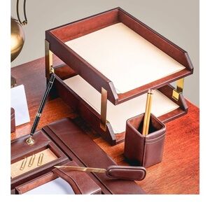 Chocolate Brown leather Letter trays with gold stacking posts.