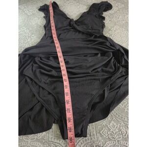 This Charmo swim dress is new with tags. It offers a flattering and supportive fit for your next water adventure. It features a textured ribbed fabric in classic black with a stylish front cutout and feminine ruffle shoulder straps. The back includes adjustable straps and a secure clasp for a personalized fit, while the built-in briefs provide full coverage. Perfect for a beach day, pool party, or tropical vacation.