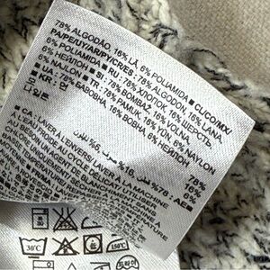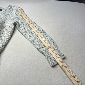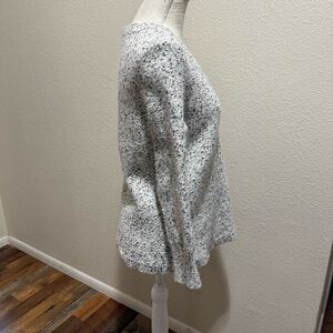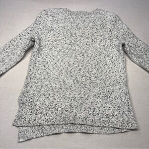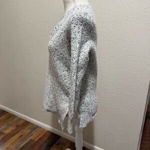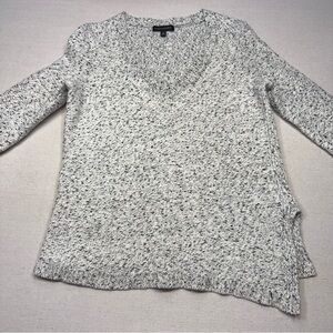 Banana Republic Marled V-Neck Tunic Sweater. It is a chunky knit pullover featuring a textured, speckled pattern in black and white. The style includes a V-neck and an angled/high-low hem with side slits.