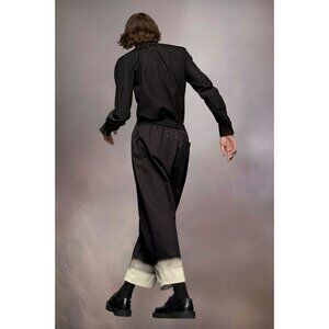 Black corduroy elastic waistband with interior drawstring tightening.