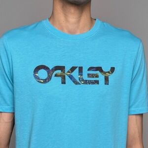 Oakley Hydrolix graphic t-shirt in a vibrant turquoise blue features a bold chest logo with a unique multi-color space or galaxy-inspired fill. Constructed with Hydrolix moisture-wicking technology, this regular fit tee is designed for comfort and performance during active use or casual wear. The lightweight, breathable fabric and classic crew neck silhouette make it a versatile addition to any athletic wardrobe.