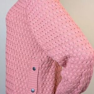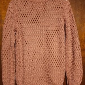 Dusty rose open-knit crew sweater with long sleeves. Lightweight breathable knit for layering. Subtle textured stitch detail throughout. Easy to pair with denim or skirts.