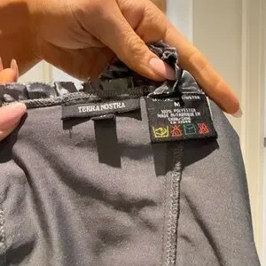 Satin corset-style sleeveless top with ruffle trim. Back hook-and-eye closure. Feminine fitted silhouette. Charcoal gray color.