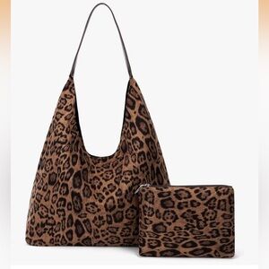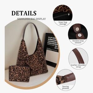 Stylish and versatile leopard print tote bag with matching pouch. Perfect for everyday use and adding a touch of wild elegance to your outfit.FAUX SUEDE MATERIAL:The slouchy work tote bag is made of faux suede leather, which is wear-resistant and good in texture, durable to use.