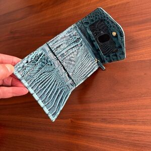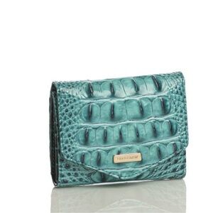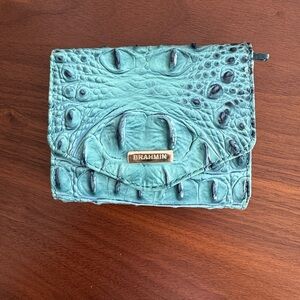 Compact croc-embossed leather wallet in vibrant turquoise. Features a small silver-tone Brahmin logo plate. Structured design keeps cards and cash neat. Textured finish offers a luxe look. Wallet in good condition. Compact and functional.
