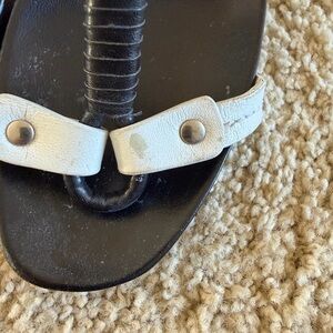 These are vintage Prada black and white strappy leather T-strap high heel sandals with silver-tone hardware
