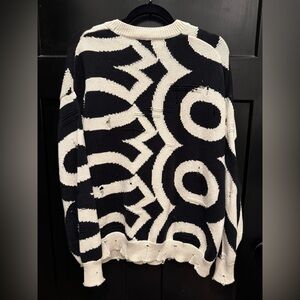 Statement Marc Jacobs oversized knit sweater featuring a bold black and cream graphic pattern with intentional distressed detailing throughout. The relaxed silhouette and chunky knit give it an effortless, high-fashion look that pairs perfectly with denim, trousers, or layered over a collared shirt.