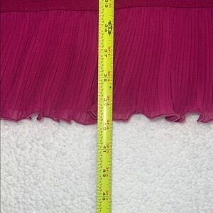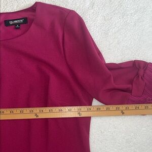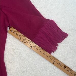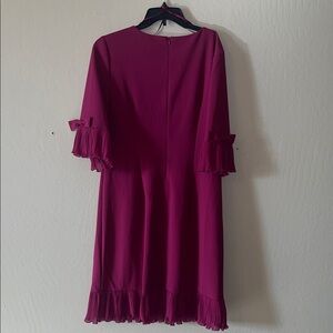Elegant magenta midi dress featuring ruffle trim. Bow accents on sleeves. Size 16 , measurements in photos, with invisible zipper