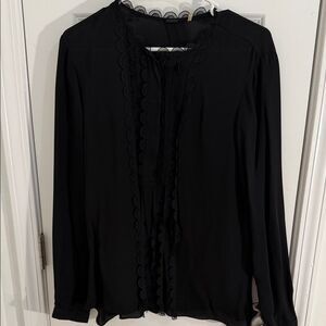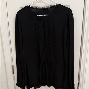 Chic black blouse 100% silk with scalloped trim. Ideal for versatile styling.size XL good condition smoke free home