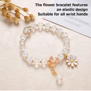Delicate beaded bracelet with clear crystal beads and a peach accent bead. Features a gold-tone daisy charm for a feminine touch. Lightweight and easy to wear for everyday or special occasions. Includes peach and clear colors for versatile styling.