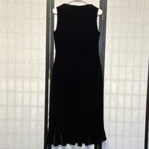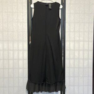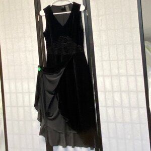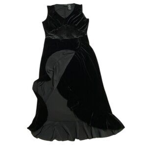 Sleeveless V Neck Embellished Waist Faux Wrap Maxi Dress from Vintage Studio. Lovingly worn – looks in excellent preowned condition. Flared A-line silhouette in solid black stretch velour. “V” neckline front and scoop back. Sheer floral velour lace inset under bust to waist in front. Skirt is overlapped in front at waist for wrapped look and tulip lower edge. Outer side has lightly gathered ruffle that goes down and around skirt forming hem. Slip on styling. Hits at ankles in back, shorter in front. Note: Some photos edited to enhance details - dress is solid black. blends timeless elegance with feminine details—perfect for cocktail parties, date nights, holiday events, or any special occasion.