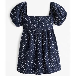 Navy blue and white polka dot mini dress from Abercrombie & Fitch. This charming piece features a flattering sweetheart neckline with pleated detailing and a smocked back for a comfortable, flexible fit. The short puff sleeves add a romantic touch, while the lightweight cotton-blend fabric ensures breathability. Designed with a subtle babydoll silhouette, it includes a soft interior lining for added coverage. Perfect for casual outings or summer events.