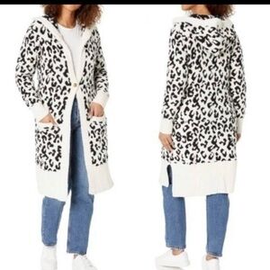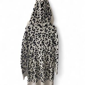 This cozy piece is the UGG Judith Knit Cardigan (also referred to as the Judith Fleece Cardigan) in the Snow Leopard pattern.