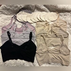 6 pumping bras, 1 of these is “kindred by kindred bravely”. Well loved but well cared for and have a lot of life left, most comfortable bras I bought for my pumping journey. Had to buy these at the end since I had to size down. Will include the reusable pads.