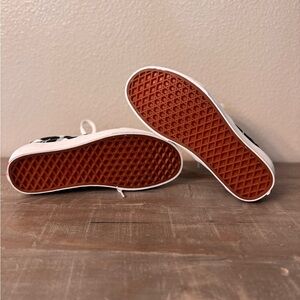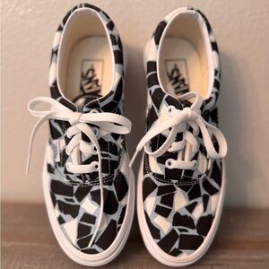Vans low-top canvas sneakers with a bold black and white abstract pattern. Lace-up front for a secure fit. Padded collar for added comfort. Signature vulcanized rubber sole for traction.