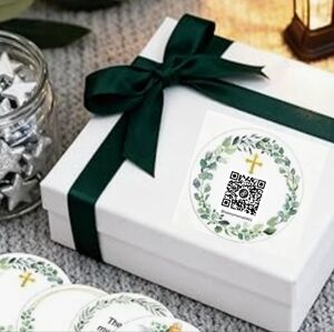 Round stickers with greenery and a cross, great way to share.