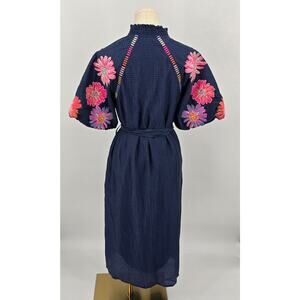 THML Navy Embroidered Puff Sleeve Textured Midi Dress XS – Cool Summer Navy with Bright Floral Accents