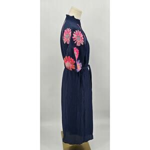 Vibrant, feminine, and full of detail — this THML navy embroidered midi dress is a standout blend of texture and color. Made from a soft crinkle Tencel blend, it features puff sleeves with bold pink and coral floral embroidery and a striped woven trim in lilac, mustard, coral, and periwinkle. The self-tie belt lets you adjust the fit, and the lightweight material keeps it comfortable and breathable.