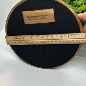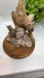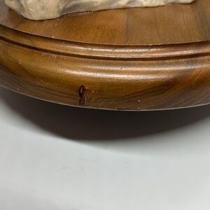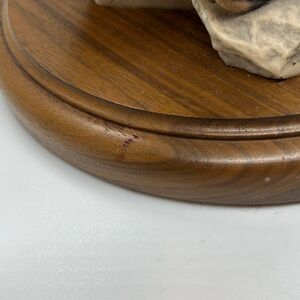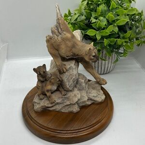 The statue measures of approximately 8 1/2 inches tall by 8 inches wide. It is on a wood base and shows a mother cougar and her two cubs. Overall, the condition is good. A white spot on the neck of the back cougar, the figurines have no breaks or hard scabs, two touch-ups on the wooden base. See photos for details and close up.