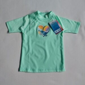 The Kanu Surf Girls Size 4T UPF 50+ Rashguard Swim Shirt in Ice Green offers reliable skin protection while also providing a stylish and comfortable swimwear option for young girls. Made from a blend of polyester and elastane, this one-piece shirt features a solid green color with a heart character design, perfect for beach outings or water activities. The athletic swim top style, short sleeves, and UPF 50+ rating make it an ideal choice for keeping kids safe and stylish in the water.