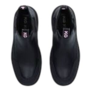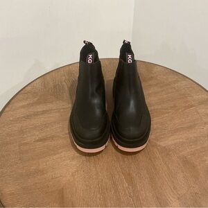Stylish ankle boots by Kurt Geiger featuring a modern and bold design. These black boots have a sleek upper with a comfortable pull-on style and elastic side panels for easy wear. The back pull tabs showcase the signature KURT GEIGER logo in pink, adding a fashionable statement detail.