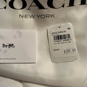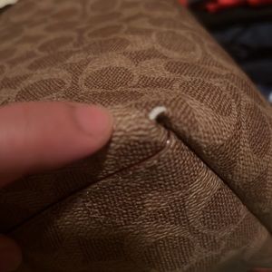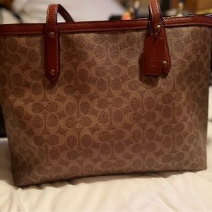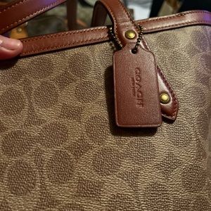 Stylish Coach tote with signature pattern. Features brown leather handles. Perfect for everyday use.