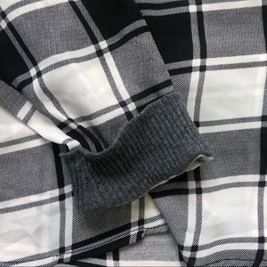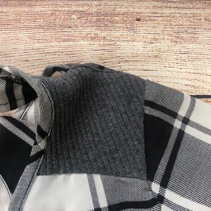 Description: checkered black and white design, made in china, grey material on sleeves and shoulders, v-neck opening on back with clasp around neck