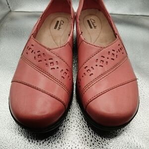 Clarks women's slip-on shoes in salmon. Soft, breathable upper with decorative perforations. Cushioned insole for all-day comfort. Flexible sole provides stable support. Stylish salmon color pairs well with casual outfits.